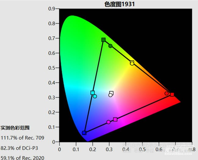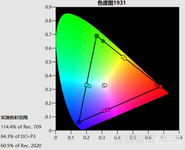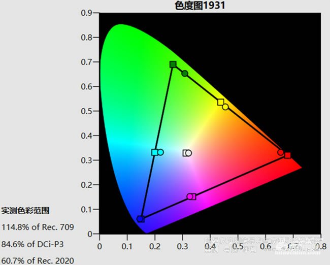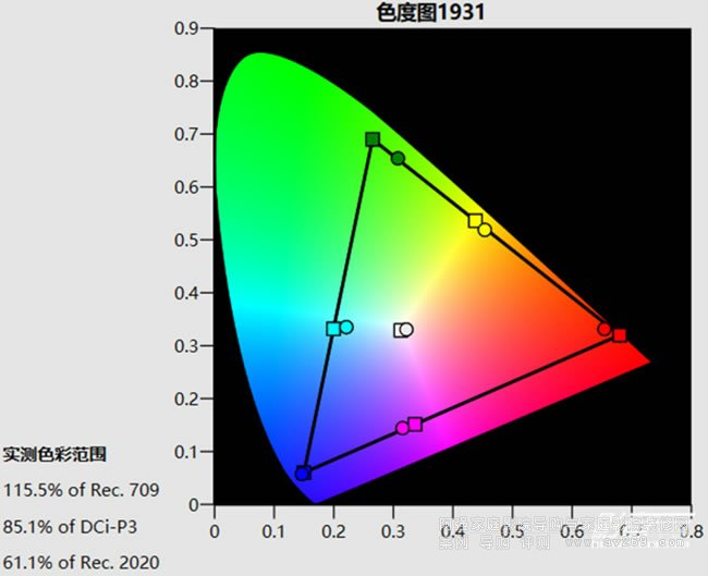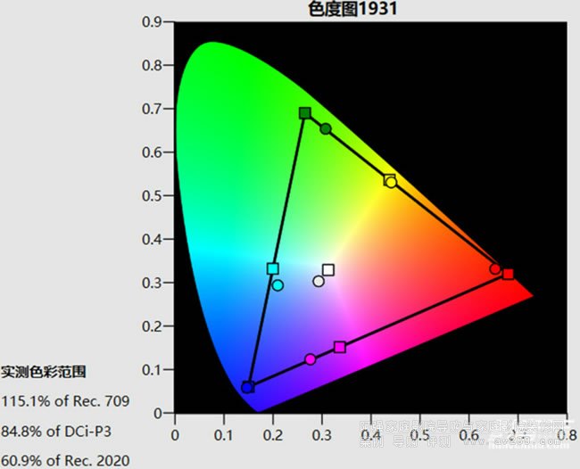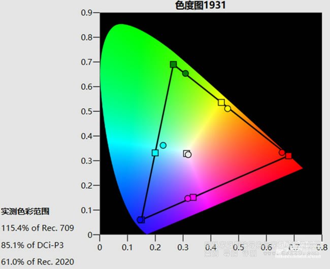 圖5: 照片模式預設選擇了偏暖的D55色溫,因此白點相比D65要偏黃,畫面亮度高于TV模式,接近30fL,色域覆蓋范圍超過了85% DCI-P3