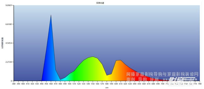 激光光源是索尼VPL-VW898在技術上的重要優勢體現。索尼官方指出VPL-VW898所采用的是高純度、可靠的激光光源,能提供長達20000小時不間斷的工作能力。為了更深入地了解VPL-VW898激光光源的技術特點,我們通過ChromaPure 3專業版視頻測試軟件與分光計對VPL-VW898進行了深入的光譜能量分析,發現在450-460nm之間的藍光擁有較為突出的光譜能量,而另外兩個峰值分別在550nm綠光與610nm紅光附近,整體能量分布曲線與上一代的VPL-VW878差不多,但藍光能量輸出更強,提升幅度超過50%,而我們也在前面的測試中觀察到不同圖像預設模式都有了顯著的亮度提升,使得整個畫面陽光感更加充足。