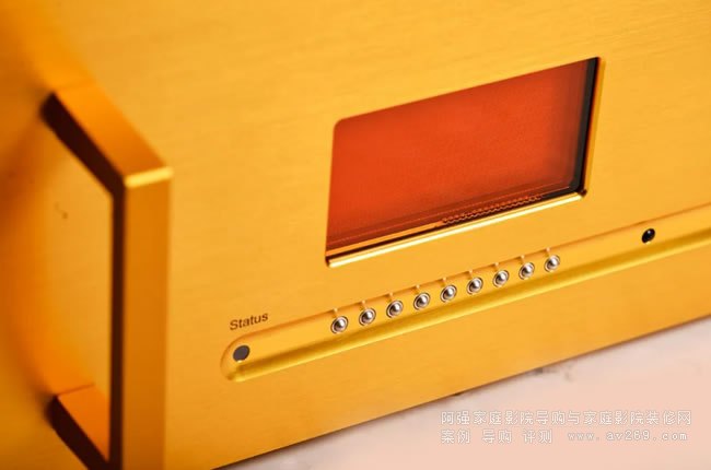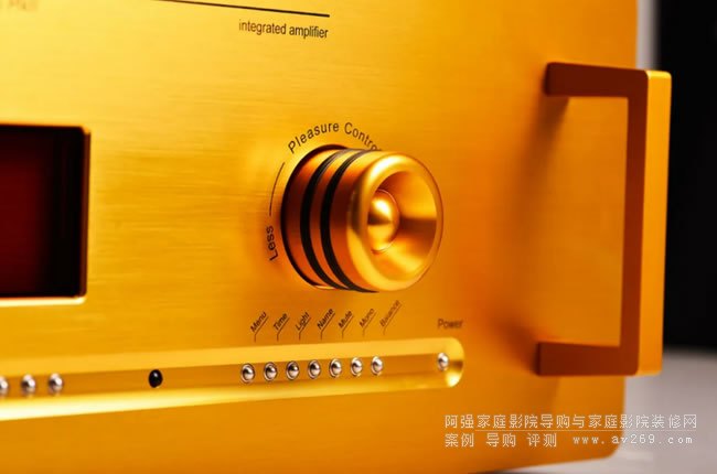 在金色的面板上,左方安排了一片大字號的顯示屏,用橙黃色字體顯示相當醒目,顯示屏下對應9個一字排開的金屬質感按鍵全為熱鍵設計,用于點擊觸發屏幕在按鍵上方對應顯示的功能,使用上邏輯性并不復雜,稍作適應就可輕松設置功放的全部功能。面板右側只有一個音量控制旋鈕,瑞士人也沒有讓這個旋鈕“閑”著,在上面的車制加工完全是鐘表級別的,顯得非常別致。
