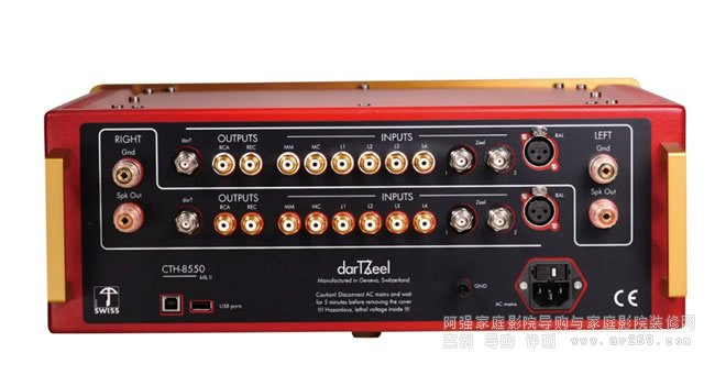 目光來到CTH-8550MK2的背板上,其所有接線端子中只有一組平衡輸入,另外就是兩組BNC和6組RCA輸入接口,作為合并功放,還提供了兩組RCA和一組BNC輸出。用BNC端子傳輸模擬信號是darTZeel的特色,這種針對數字電路開發的端子的傳輸頻寬比普通RCA端子高很多,可滿足寬頻信號的傳輸,而且由于帶有卡鎖設計,因此非常保險。從端子的設置可印證了darTZeel堅守單端線路的理念,而只設置一組XLR平衡輸入,也僅是為滿足不同玩家的訊源輸出標準提供連接而已(專業器材的平衡傳輸理念)。而喇叭輸出端子則每聲道提供一對,背板左下角的USB口并非用作插接儲存外設播放音樂,而是用作新機激活與后續系統升級之用。