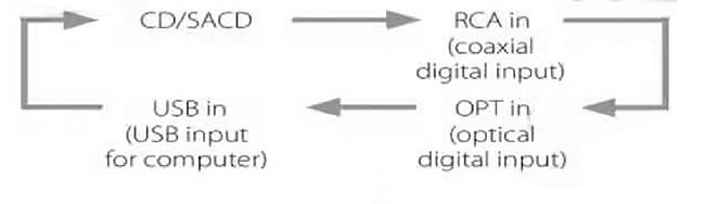 短按出入倉左手邊MODE鍵,可分別切換成RCA輸入、OPT輸入或USB輸入或CD/SACD碟片播放。當選擇外部數(shù)字輸入時,所選擇輸入的名稱和采樣頻率將顯示在顯示器上。如果沒有輸入信號或未與輸入信號同步,所選擇輸入的名稱將一直閃爍。當選擇CD/SACD時,停留5秒無操作,系統(tǒng)將自動保存并退出界面。