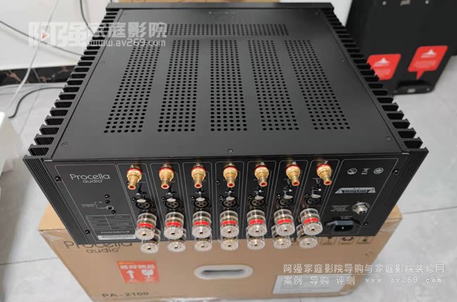 PA-2100是Procella現役型號中,第一臺支持七聲道的后級功放。雖然整機的設計風格依然是Procella一直堅持的極簡風格,面板上僅有產品Logo、指示燈和電源鍵,不過整機的尺寸實在是大,和自家其它兄弟相比,儼然是一只龐然大物。
