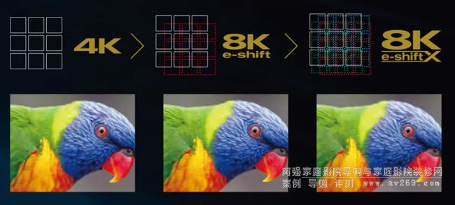 新型8K e-shift X技術(shù)使用240Hz高速D-ILA素子在四個對角方向(上下左右)刷新,實現(xiàn)以完美8K分辨率顯示8K內(nèi)容。
