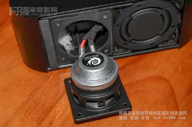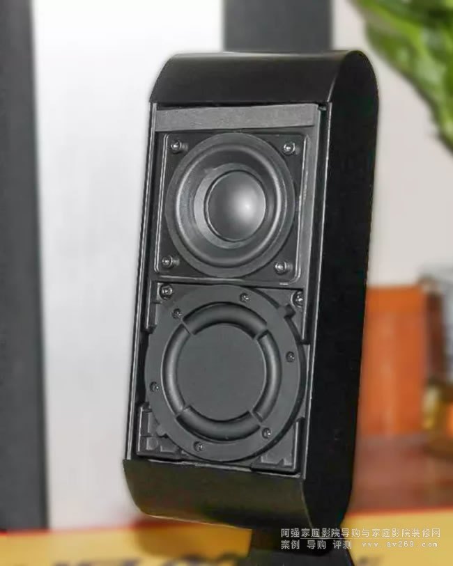 與其他四只音箱不同,中置是橫向擺放的。喇叭單元也是加強版的,畢竟人聲對白是影院系統里最重要的,得優先保證。