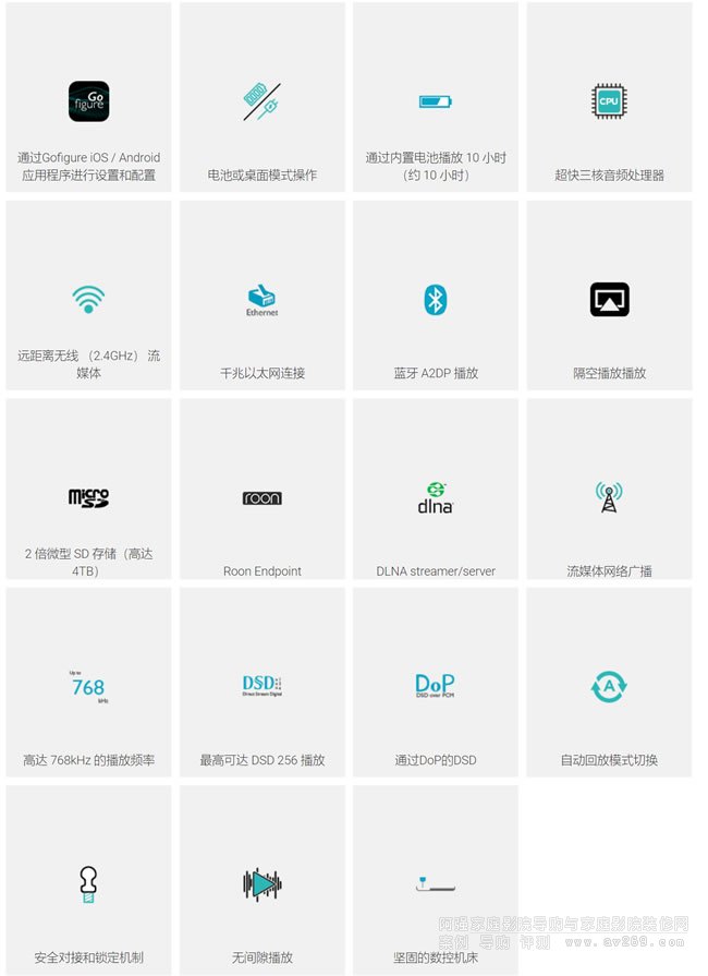 Roon endpoint,DLNA(服務(wù)器和渲染器),AirPlay,藍(lán)牙音頻(A2DP),Tidal,Qobuz,互聯(lián)網(wǎng)廣播等等...