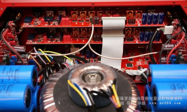 ▲CTH-8550 MKII的內(nèi)部最顯眼的就是環(huán)形變壓器,而且是上下二個(gè)一大一小。這二個(gè)環(huán)形變壓器內(nèi)部都是二組繞組,分別供應(yīng)左、右聲道。下面那個(gè)大的供應(yīng)功率輸出級(jí),上面那個(gè)小的負(fù)責(zé)前級(jí)線路,以及各項(xiàng)操控顯示線路所需電源。
