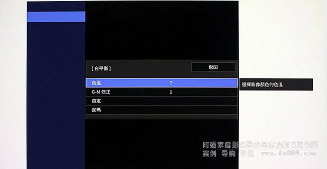 EH-LS12000B在「圖像」的「白平衡」選項里有「色溫」、「G-M修正」、「自定」與「伽瑪」等調整選項。