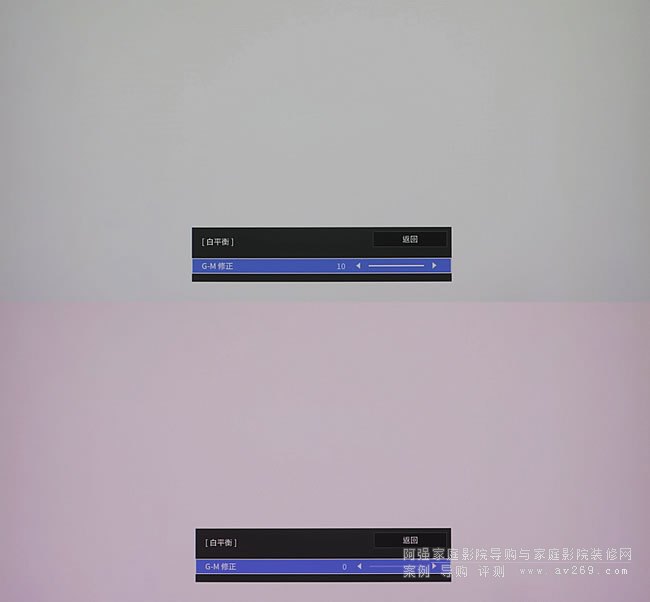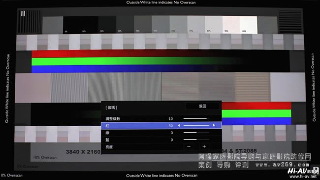 再來「自定」里有RGB三原色各自的「減少」或「增加」調整,這在常規投影機調整菜單里是常見且都有的,「減少RGB」部分就是常規常說的「黑平衡」調整,調整的是畫面暗部之色溫平衡;至于「增加RGB」則是「白平衡」調整,調整的是畫面亮部之色溫平衡。