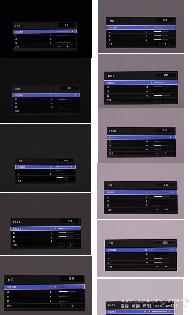 EH-LS12000B「圖像」菜單「白平衡」選項里最后的「伽瑪」調整是Epson所獨創的,它可以針對由暗至亮(0 IRE到100 IRE)分11段做RGB的平衡調整。 其實,這項功能在Epson三年前推出的EH-TW8400就首度出現了,只不過當時EH-TW8400只有區分為8段(7階),但這次新旗艦EH-L12000B則增加為11段(10階),這是為什么呢?