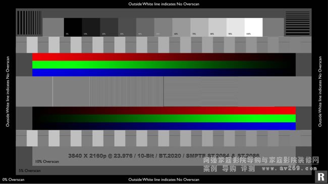 請看看這張影像測試圖,我們要關注的焦點是最上面一排灰階方塊,除掉最左與最右的灰色方塊,從0%(全黑)開始每格增加10%直到右側最亮的100%,代表著畫面里0 IRE、10 IRE、20 IRE...... 90 IRE到100 IRE,這10階明暗方格其實是測試圖與測試儀器常有的灰階檢測調整基準,您看出Epson為何將EH-LS12000B的Gamma調整增加為11段(10階)了嗎? 就是要分別精準對應這10個灰階方塊!