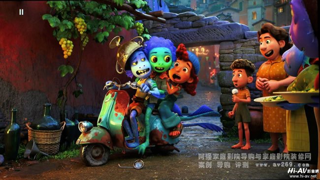 《路卡的夏天》(Luka)片尾三位男女主角騎著偉士牌機車的場景,這部動畫電影的色彩非常繽紛飽和,三人的臉部剛好是紅、綠、藍色調,在EH-LS12000B精準的色彩演繹表現下,臉部的色彩漸層與立體感非常好,金色獎杯、石墻、葡萄、樹葉、玻璃酒瓶與偉士牌機車生銹鈑金的質感都十分寫實。