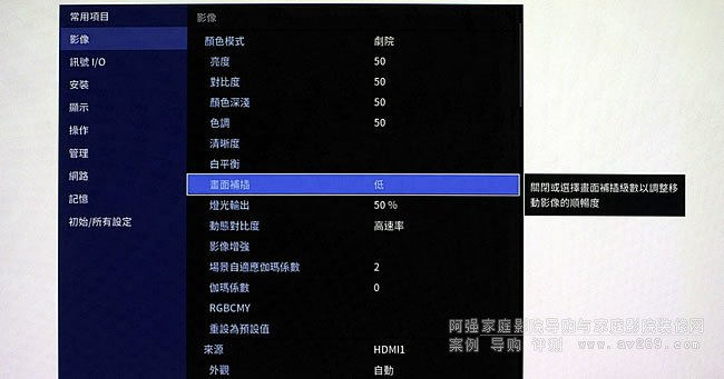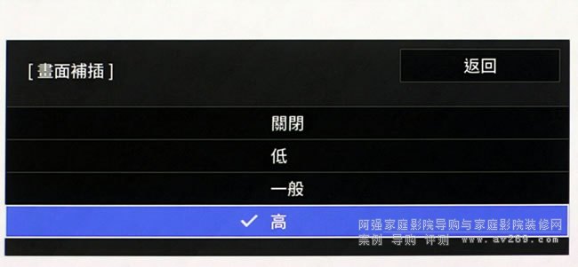 EH-LS12000B的「畫面補插」有「關閉」、「低」、「常規」及「高」等幾段選擇,Epson原廠并沒有公布「低」、「一般」與「高」的畫面更新格率,我在評測時以「高」的配置為主。