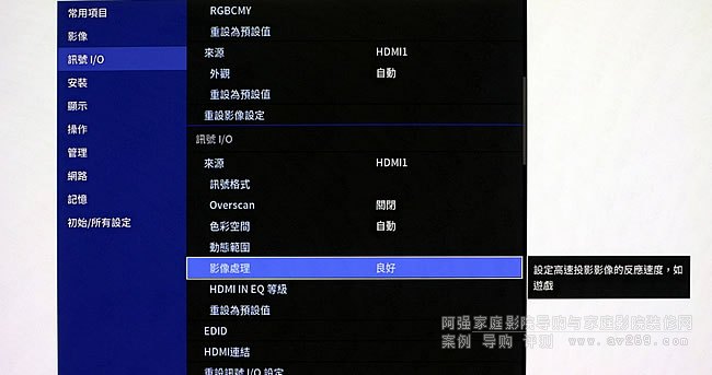 要注意的是,在「訊號I/O」菜單里的「圖像處理」有「良好」與「快」兩個項目可選擇,倘若用家設置為「快」的話,「畫面補插」就會強制設置在「高」的狀態,「影像」菜單里的「畫面補插」選項就會消失不見、無法切換至其他檔位。