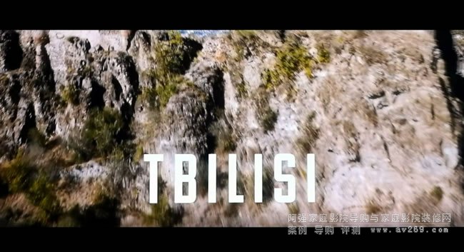 再來是《速度9》UHD BD光碟第16軌的開頭,各位可以看到白色TBILSI的地名非常清晰,但背景的巖石山壁就非常模糊,其實這不是我照片拍攝的問題,而是本片此段以空拍機拍攝的影像就是如此模糊,完全看不到巖壁的紋路與樹木細節。 以4K24p原片格式觀看時是如此,但一旦將EH-LS12000B的「畫面補插」開到「高」,巖壁與樹木的清晰度馬上就提高非常多。