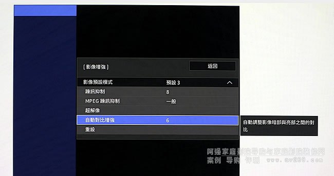 EH-LS12000B的動態對比度高達250萬比1,這是非常驚人的超高性能,本機在菜單里也有對比度相關的優化調整項目,「影像增強」里的「自動對比增強」有多段預設值可選,可依據投影銀幕的增益與投影尺寸大小去做最佳數值選定。