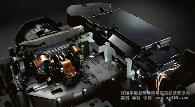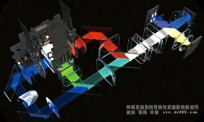 這是Epson原廠公布EH-LS12000B內部由后往前看的結構,激光光源模塊就在機箱右側的長方形盒子內,與其連接的部分是激光光的行經路徑(可比對前一張圖片),三片軟性電路板所連接的就是本機的RGB TFT LCD顯像板,三原色影像匯聚之后經過Pixel Shift組件再經由投射鏡頭射出。