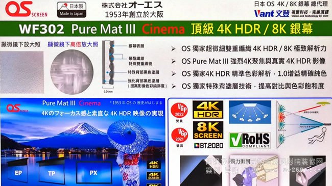 這張WF302銀幕幕布是日本OS Screen的第三代Pure Mat III制品,獨特的超微細雙重編織結構不僅對應4K HDR還能對應8K影像解析之所需,而且1.0增益不僅使其可視角超寬廣,色彩演繹也勝過本站參考銀幕OS Screen BU-201 ,盡管新臺幣二十余萬元的參考售價還高過Epson EH-LS12000B,仍然強烈推薦給EH-LS12000B的用家。 這張WF302銀幕推出以來和其他OS Screen銀幕一樣獲獎無數,累積已獲得日本影音專業媒體近20個年度大獎(請見這里),稍后本站也會有OS Screen WF302的詳細器評報導。