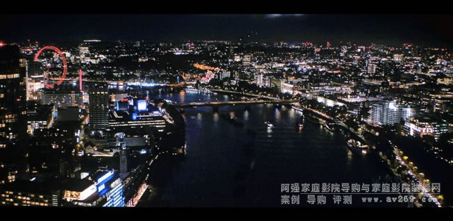而上圖這個《玩命關頭9》UHD BD光盤第10軌一開頭的倫敦高空夜景,所呈現出來遠近建筑物窗戶的光芒與泰晤士河極富層次的反光與倒影相呼應,構成明暗對比極強的漂亮畫面。 再者,要請各位注意的是,如同星光點點的燈光的色彩與種類非常豐富,這也顯現了EH-LS12000B在豐富與精準色彩階調上的成就。