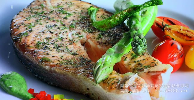 此香煎魚排的鏡頭有紅、黃、綠等豐富的色彩,是我用來調整影像常用的畫面之一。 Epson EH-LS12000B不僅能清楚描繪相近色彩的連續變化(例如左側的綠色醬料、中間綠色的蘆筍、右側紅色與黃色的小番茄),使得各物件都有鮮明的色澤與立體感,蘆筍尖端的立體細節與魚排上的香草微末,也都充分展現EH-LS12000B的「真實4K」精細描繪。