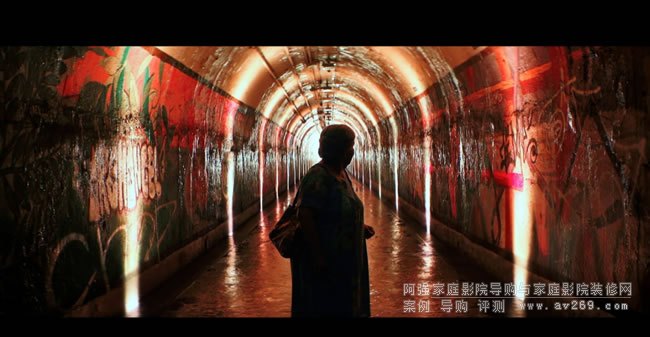 以紐約華盛頓高地拉丁美洲裔移民社區為背景的歌舞片《紐約高地》(In the Heights)有許多鮮明的色彩,上圖是片中老奶奶過世前「人生跑馬燈」所見到的地鐵入口通道,有相當豐富且不斷延伸的明暗階調變化,透過Epson EH-LS12000B與OS Screen WF302的共同演繹,整體來看有很強烈的立體感,每一「段」 自身的明暗層次與向內延伸各「段」明暗都有清楚變化,暗部墻面涂鴉的色彩同樣豐富,更厲害的是還可以清楚看到左右側墻墻面微小突出與凹入的反光線條,這是我在Sony VPL-VW520ES所投射畫面上無法清楚看到的。