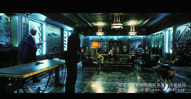 除了明暗動態范圍寬廣之外,值得注意的還有EH-LS12000B在不同明暗階調的精準色彩呈現,這也是Epson投影機一向傲視群倫且讓影像畫質更出色的特點。 這一幕是《捍衛任務2:殺神回歸》(John Wick: Chapter 2)男主角回大陸飯店軍火庫換用穿甲彈槍械的場景, 天花板與大理石地板的主要色澤是綠色,但是在天花板黃色吊燈與側墻藍色照明下,各個不同區塊卻顯現出不一樣的色澤,可以看到Epson EH-LS12000B將這種復雜光源的連續色澤變化描繪得非常清楚,天花板與地板的紋路都清晰可見(您有發現茶幾前方地板上有個半身人像嗎? ),家用投影機要有如此精準的色彩與細節呈現可真是不容易。