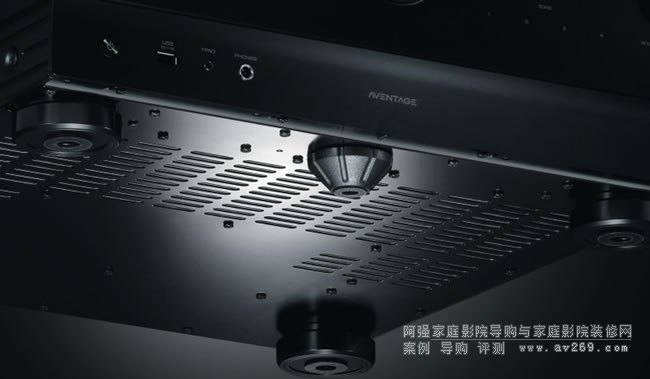 ▲AVENTAGE系列的機箱非常重視抑振結構,翻到機箱底部會發(fā)現RX-A6A除了四支的粗壯的腳座支撐外,面板正下方還用上了“第五隻腳”,原廠將其名為“A.R.T.抗振腳座”。因為原廠發(fā)現變壓器的底部,是環(huán)擴振動最大的地方,所以這個A.R.T.抗振腳座的安裝也是透過的科學儀器實測,經過不斷嘗試后才決定設在“中央前方”靠近面板的位置,可做為機箱的“機械接地”讓機底減少約九成的振動,大幅降低機箱振動對音質產生的不良影響。實際聽起來會提升低頻段的純淨度,強化細節(jié)表現,減少氾濫能量產生
