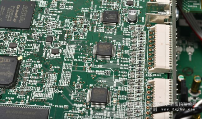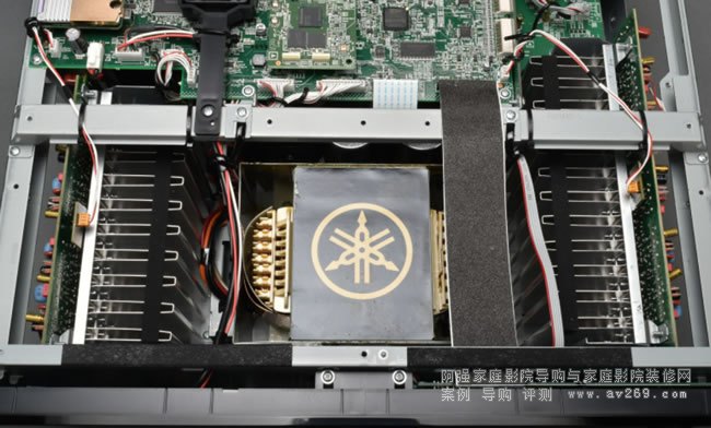 接著訊號經過低通率波電路后,進入第二層的前級電路板,採用供電、接地分離的設計,可以所短傳輸路徑,讓電流傳輸更直接并降低雜訊干擾。第三層則是供電電路,首先採用一只大型的EI變壓器,接著採用兩顆大容值的電容,為大動態(tài)的劇院音效提供充沛的供電。它的功率放大電路和散熱片採左右聲道對稱的設計,并安置在EI變壓器的的兩側,這是模仿Yamaha高階Hi-Fi擴大機A-S3200的發(fā)燒設計。