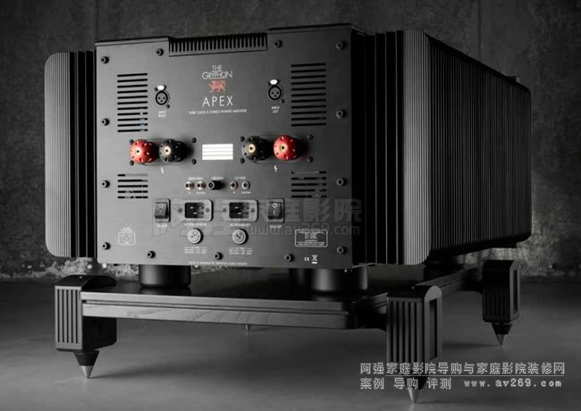 而Apex后級分單聲道與立體,每聲道輸出1,800瓦RMS(1歐姆負載)。單聲道內每聲道有64個雙極功率晶體,每聲道使用大于1法拉(1,040,000uF)的濾波電容,每聲道的電源供應使用二個2,000VA環形變壓器。立體聲一部大約450磅重,單聲道機合起來有900磅重。