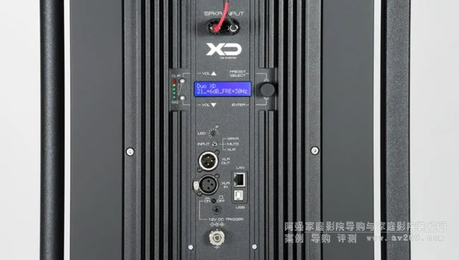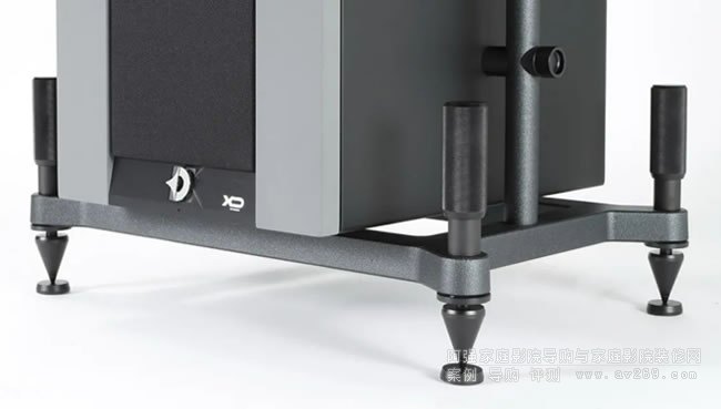 在中音單元之下較為小型的則是它的高音號角。下部的箱體主要承擔了低音的重播工作,搭載了2只12英寸的低音單元,并由1000W的功放驅動。除此之外,主動式的低音還提供了非常豐富的調整選項,以在各種環境下達到最佳效果。整個巨大的低音箱體置于一個金屬框架上,以此讓箱體更為穩固進一步提升低頻的質量,底部的腳釘更是具有俯仰角可調的功能,方便獲得最佳 的擺位。以此,單只Duo XD的重量達到了近90公斤。