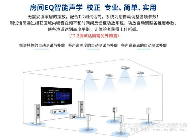 特別留意的是,房間智能聲學校正功能的接口在光纖接口上方,接入T-2專業測試話筒后,將其擺放至“皇帝位”,測試話筒工作時對房間環境聲學特性進行拾取,自動識別所連接揚聲器和低音炮的數量、位置和系統的最優拐點頻率,以及主要聆聽距離等,自動校正聲場,從而獲得更精確的音頻定位,使各聲道達到高度平衡,讓體驗者獲得絕佳聽感。