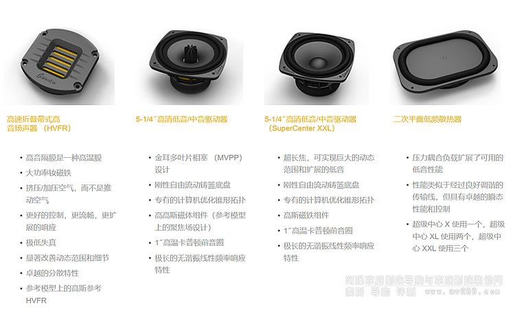 美國金耳朵SuperCenter Reference參考中置音箱,SuperCenter陣容的頂端是參考性能SuperCenter Reference,是大型GoldenEar家庭影院系統的完美搭配。它只有35英寸寬,包括四個5-1 / 4"驅動器,利用為Triton Reference開發的聚焦磁場磁鐵結構,GoldenEar Reference高斯高速折疊帶高音高音揚聲器和三個平面無源輻射器。我們獨特的線性相位交越網絡采用完全平衡的拓撲結構,可降低雜散電容,從而顯著提高清晰度。它利用精密薄膜電容器和特殊的內部布線來完美地融合驅動器,以獲得無縫均勻的聲音。有三個獨立的內部腔室:一個較大的內部腔室位于中心,其中包含兩個5-1 / 4 ̋驅動器,它們向上運行以滿足高音揚聲器,并與中央較大的7 ̋ x 10 ̋無源輻射器耦合,以及兩個較小的驅動器,每個驅動器都包含一個特殊的5-1 / 4 ̋驅動器,該驅動器專為低頻響應而設計,其運行頻率高達500 Hz, 并連接到一個較小的 6-3/4 ̋ x 8 ̋ 無源器件