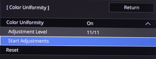 由于圖像的均勻性可以在較長的一段時間內部分變色,愛普生現在還在LS系列投影儀上添加了色彩均勻性功能。這使您可以在每10個IRE的11個級別上使用白平衡校正來拉直變色,因此在灰度中具有10%的差異。您確實需要測量設備,但通常會將投影儀送回進行維修。