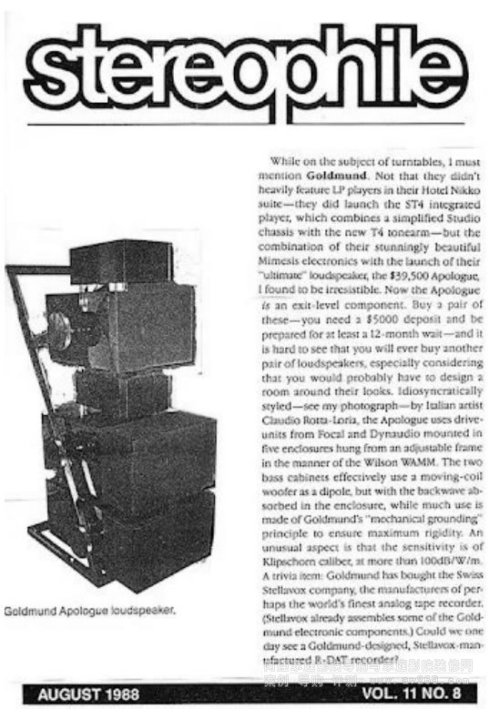 高文喇叭,誕生于1987年,那就是第一代無源Apologue,重量達到300公斤。1988年這個喇叭作為藝術品被紐約現代藝術博物館列為永久珍藏。外觀設計來自意大利著名設計師Claudio Rotta-Loria。