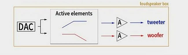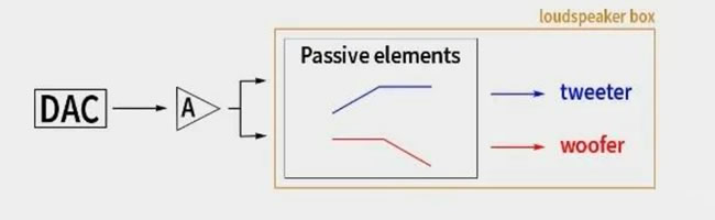 有源喇叭分兩種,一種是模擬有源,一種是數字有源。先看模擬有源,從解碼器開始,所有的設備也都在喇叭內,經過DAC后,需要進行分頻器分頻。