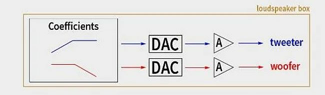 從示意圖可以看到,機器人是純數字分頻有源系統——與模擬有源系統一樣,放大器直接驅動揚聲器單元。但是,不同點在于,每個單元以及功放前,還需要要一個單獨解碼器(DAC)。分頻器不是物理性的,而是基于軟件,用算法插入到 DSP 中。