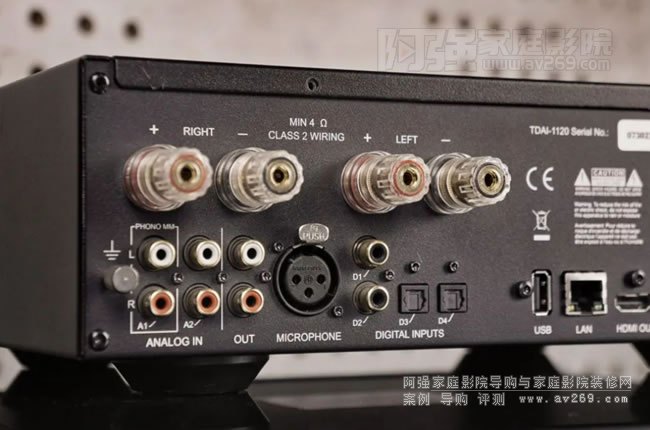 在接口配置上也是相當(dāng)豪華:TDAI-1120提供四組S/PDIF輸入接口,光纖同軸各二組,還有一組USB type A輸入,可供連接FAT 格式的硬碟,播放硬碟內(nèi)儲(chǔ)存的音樂檔案。