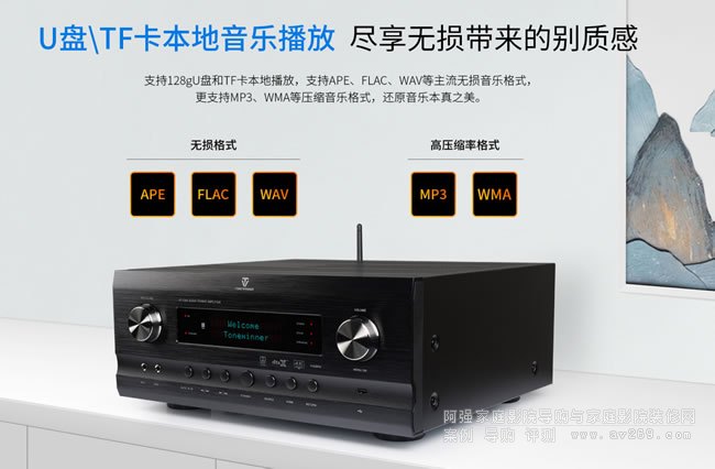 天逸AT2300家庭影院功放11.1聲道前級(jí)處理器是專門針對(duì)熱愛生活的國人而打造的“創(chuàng)世代”全景聲影K一體功放。集家庭影院系統(tǒng)、個(gè)人音樂中心和專業(yè)卡拉OK于一體的高清影音中心機(jī)。支持Dolby Atmos全景聲音效及DTS:X沉浸式音效,支持4K視頻技術(shù),兼容3D、HDR、Dolby Vision等視頻格式;同時(shí)具有U盤、TF卡本地播放,支持多種無損及高壓縮音頻格式。手機(jī)APP控制、藍(lán)牙無損傳輸,讓好音樂隨時(shí)可享。專業(yè)級(jí)5.1.2聲道沉浸式卡拉OK效果行業(yè)首創(chuàng);ARC音頻回傳,讓智能電視秒變點(diǎn)歌機(jī),是一款可全面滿足家庭娛樂的高端影音中心機(jī)。