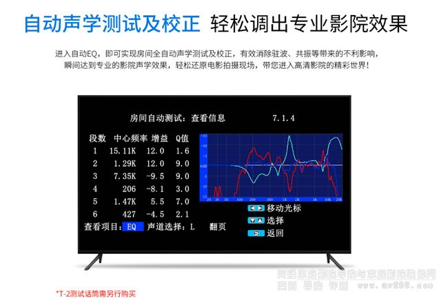 8.內(nèi)置聽音房間自動(dòng)測試及補(bǔ)償功能。頻譜特性的自動(dòng)測試與補(bǔ)償,各聲道響度的自動(dòng)測試與補(bǔ)償,各聲道距離的自動(dòng)測試補(bǔ)償;