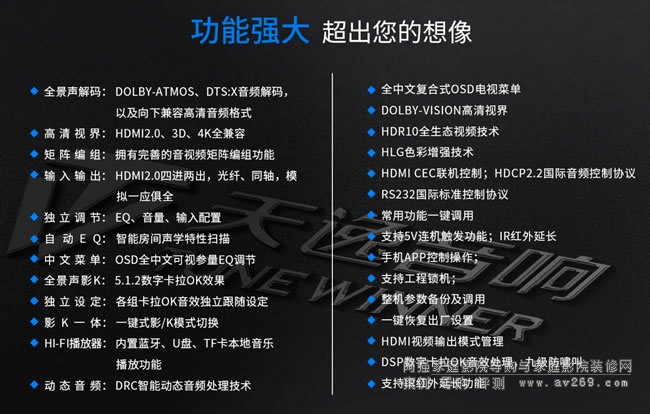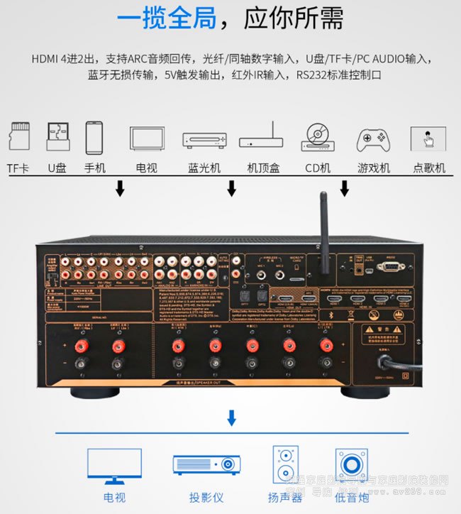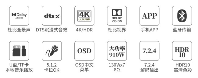 13.支持HDMI 6進2出,2組同軸2組光纖數(shù)碼音頻輸入,3組模擬音頻輸入;