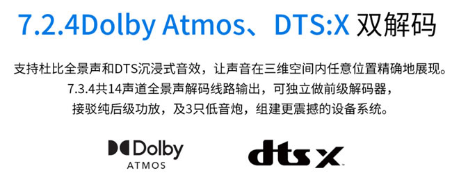 12.支持從2.0聲道到7.1.4聲道等10多種揚聲器配置;