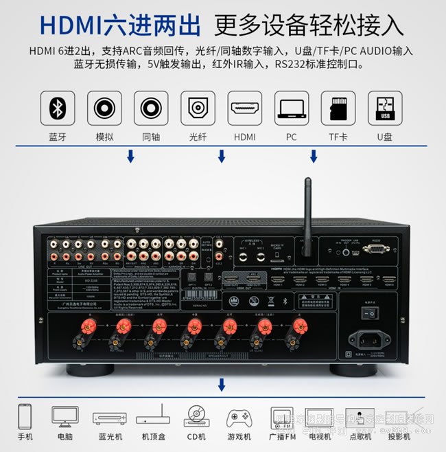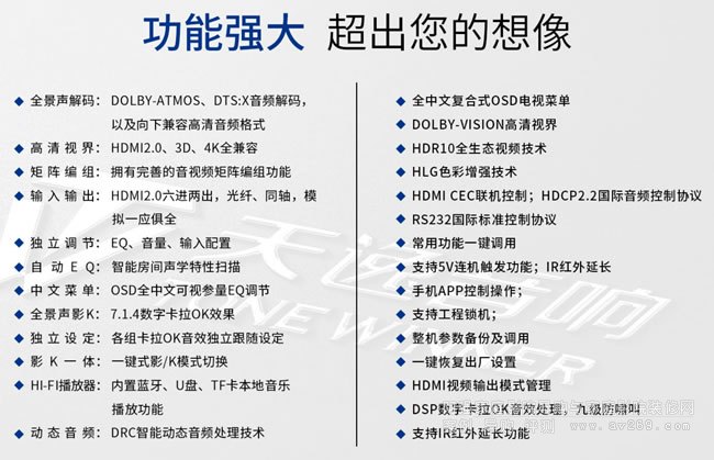 20、 支持2組光纖,2組同軸,3組立體聲多功能音頻輸入;21、 DRC智能動態音頻處理技術;