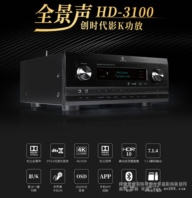 天逸HD3100全景聲多聲道功放由美國THX認證工程師親自帶隊研發設計,且獲得美國Dolby Atmos、DTS:X、HDMI2.0高清音視頻認證。集影院系統、音樂中心、專業卡拉OK于一體的高清影音中心機。支持Dolby Atmos全景聲音效及DTS:X沉浸式音效,支持4K視頻技術,兼容3D、HDR10、Dolby Vision等視頻格式;具有U盤/TF卡本地播放、ARC音頻回傳、RS232智能中控;專業級5.1.2聲道沉浸式卡拉OK效果行業首創。專為定制高清影院、影吧市場研發的一款多功能、高性價比的全景聲影K一體功放。