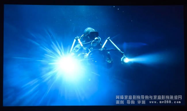 在深海潛水的畫面中,不僅可以保持著深海中深邃黑色背景的暗位,同時面對手電筒強光的光芒感和水中氣泡的細節還原都有著絕佳表現,可以說JVC N98在保持著傳統黑位細節表現力優勢的同時,在全新混合激光光源的強力加持下已經成為了市場中有著頂級HDR表現力的投影機。