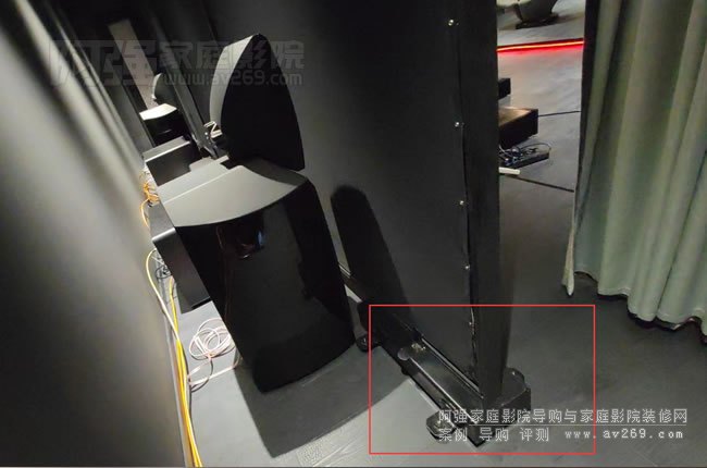 投影幕安裝好后就是其他影音設備的安裝調試了,在幕布后面隱藏著JBL Array系列音箱,SVS旗艦低音炮,還有剛才固定幕布的特寫支架。
