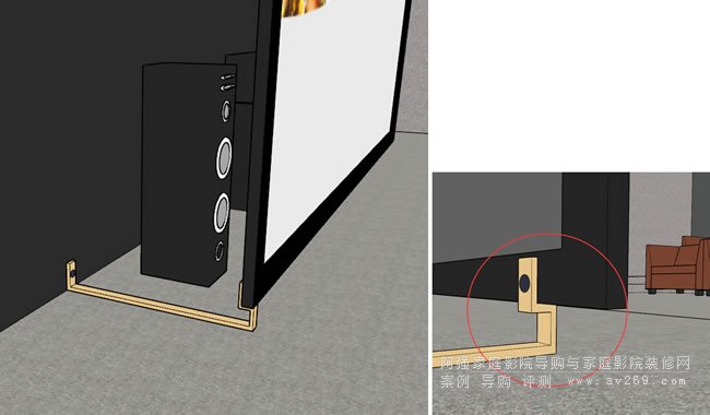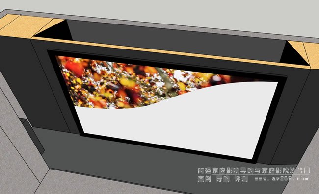 這是整個影音室的空間設備規劃參考,我們接觸的時間節點較晚,部分設備線路已經預留并鎖定,在原來的基礎上我們增設側環繞兩只,畫面增大到220-230英寸,采用高增值固定透聲幕,前期的思路是希望業主購置的8年前的索尼投影機可以用上,后部增設薄地臺和前面的幕布處地臺相呼應。