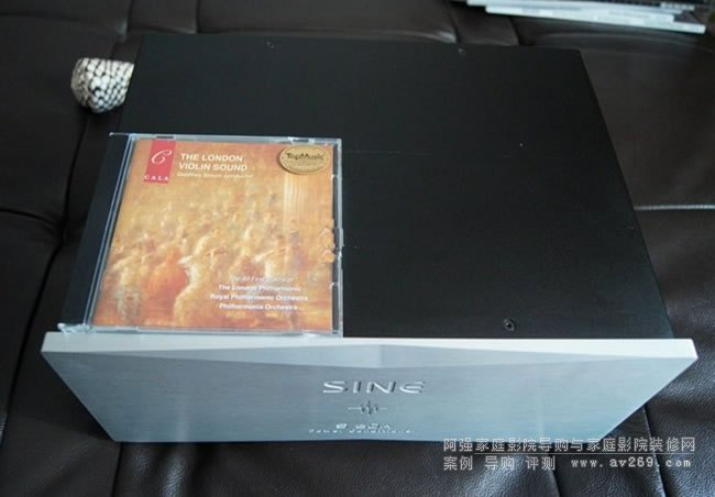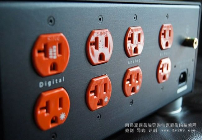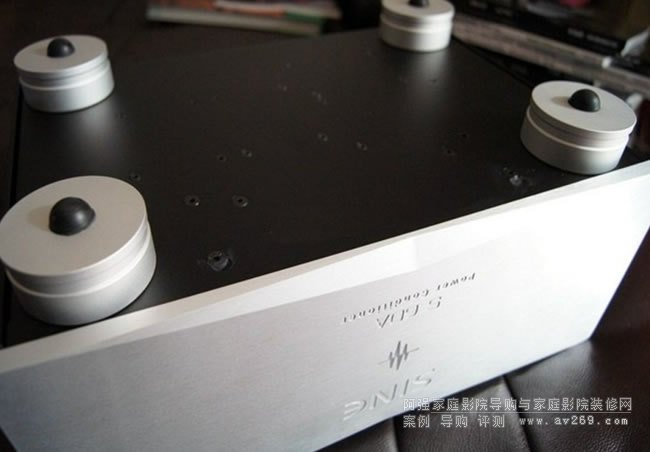S60A背板設計同樣簡潔有序,共有上下兩排4組計八枚SINE高級美標橘黃插座。其中,一組為Digital/數碼類外設專供,兩組Analog/模擬類器材專供,和一組By Pass/直通插座,一枚大型銅鍍金接地樁位于背面右側上方,表面光潔細膩,制工極為精致,其下方便是美標電源輸入端口。S60A的電源開關采用專業船型開關豎置于機箱左側,開關兩側各立有一道邊框,用以防止可能出現的誤碰操作導致的非正常關機,考量可謂細致。值得一提的是,S60A底座安裝有四枚重型圓柱狀鋁制承重腳,直徑達55mm厚25mm,且腳座底部中心還安裝有直徑10mm的半球形塑膠減震腳,以期與鋁座搭配形成復合型綜合減震腳,盡管腳座尺寸在塑形比例上稍嫌夸張,卻從繁復的加工工藝上,體現出SINE對于器材整體隔音避震上的用心良苦。