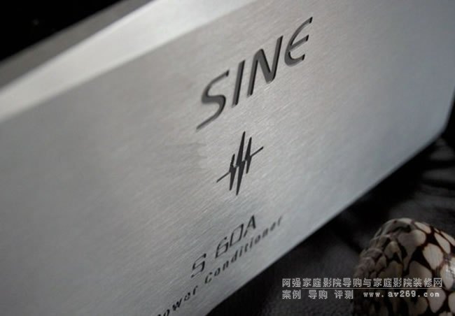 在光標上方便是一行大型SINE廠標英文字母橫貫,銑刻刀法一氣呵成工藝精湛,下方則為電源處理器的型號S60A和Power Conditioner兩行英文字母銑刻堆疊,字芯涂敷黑色,在銀色面板的映襯下更顯簡約質樸,大氣風尚!Power Conditioner正是電源處理器的英譯。