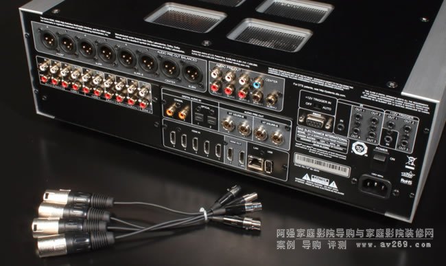 M17 V2i是11.1聲道環繞前級,不過背板上緣左半部只容納得下8個XLR平衡類比輸出(下層7聲道與1組超低音),那麼難道7.14配置的4支天空喇叭就只能使用非平衡輸出嗎?并非如此,NAD在「AM 17音頻MDC模組」備有4組mini XLR平衡前級信號輸出端子,本機也附贈了4條mini XLR轉接XLR公頭的轉接線,如此4支天空喇叭聲道就能以XLR平衡方式輸出。