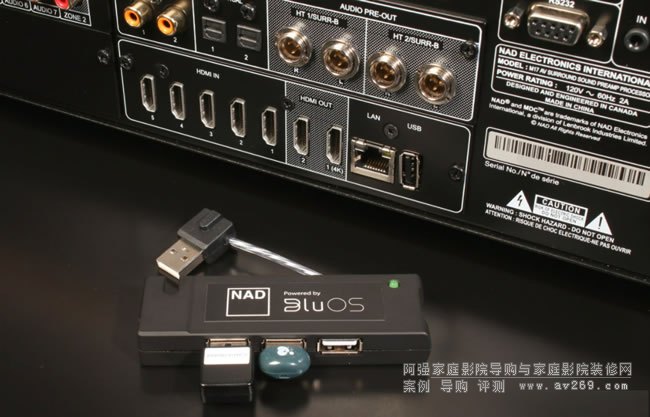 M17 V2i附有外接的BluOS模組,只要插上背板的USB端子,就能讓本機新增BluOS對應機能。