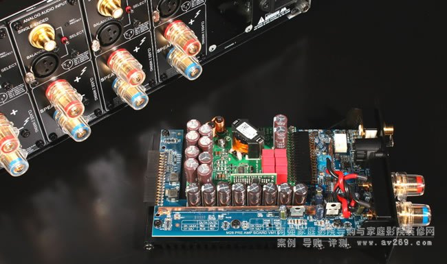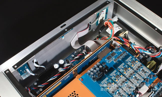 這是移去上蓋之后的NAD M17 V2i俯視圖,機箱內部左側與前緣的L形區塊都是電源處理區,本機的數位與類比電路供電完全分離。橘色金屬隔板內是本機的4個MDC擴充模組插槽,靠近背板處是本機的XLR平衡類比音訊端子接線板,機體正中央是數位類比音訊轉換電路板。